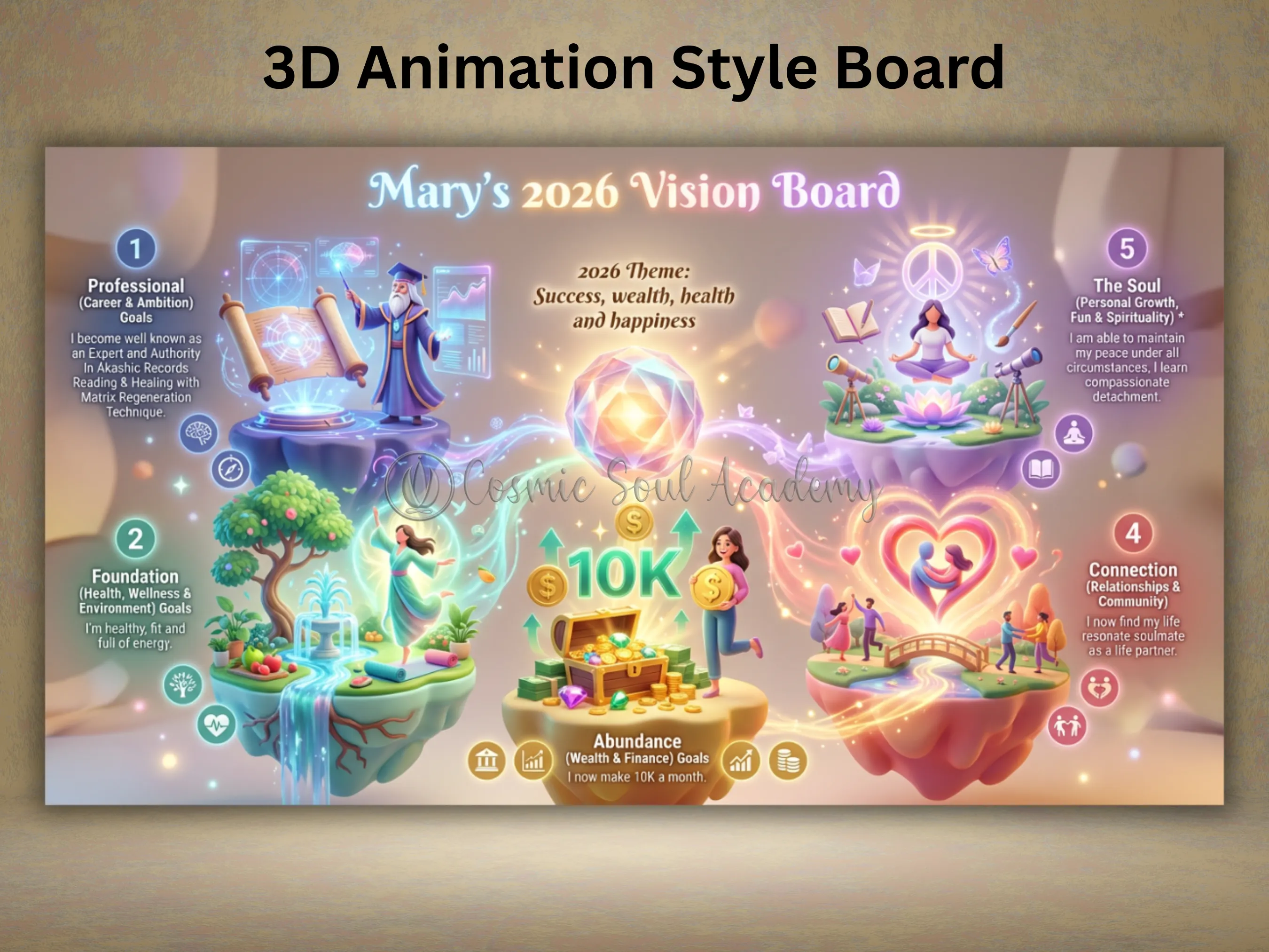 Playful, vibrant, Pixar-style aesthetics full of colour and life. Ideal for high-energy goals, big dreamers, and those manifesting joyful abundance.