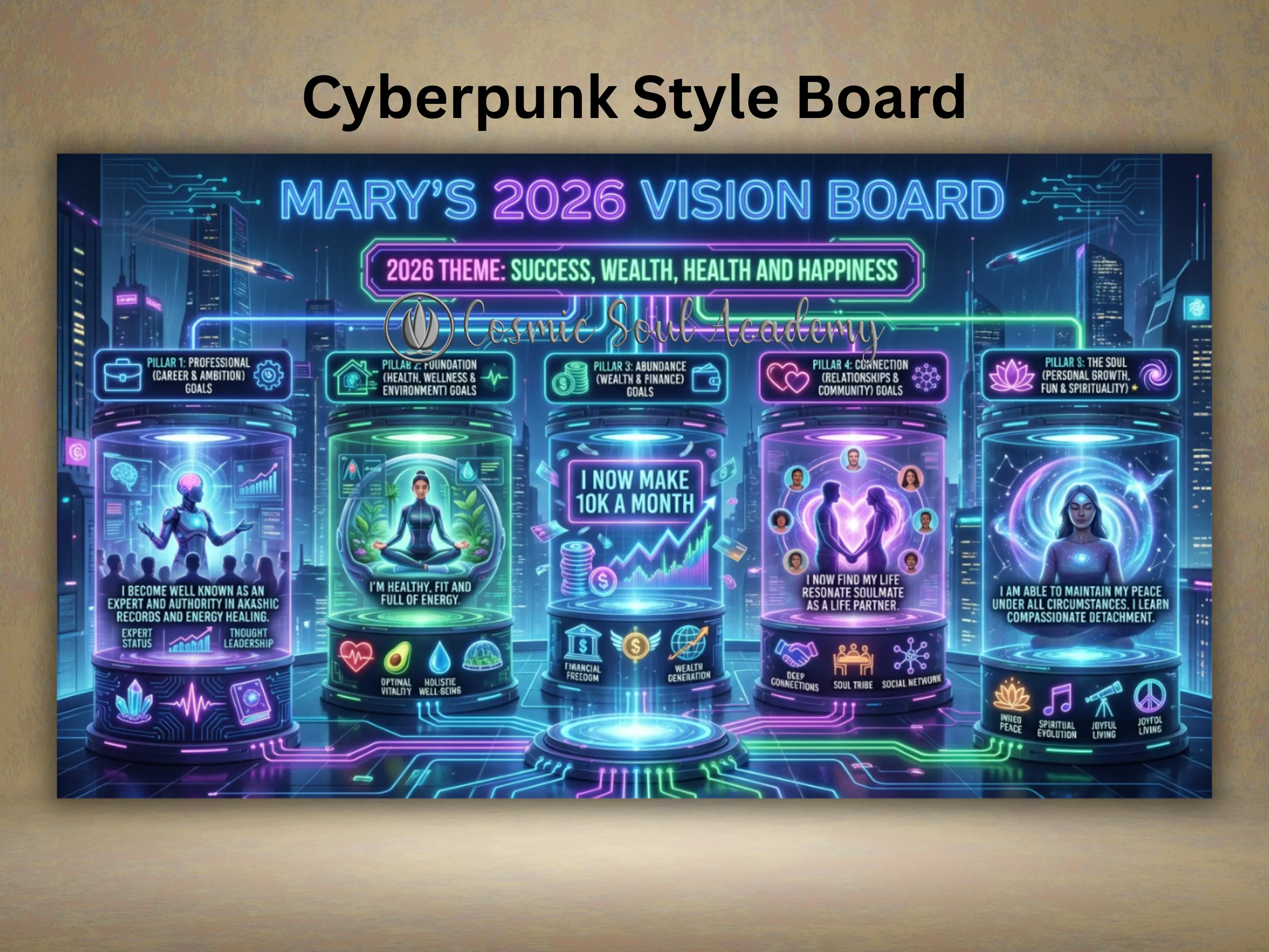 Bold, futuristic, high-tech vibes with neon energy and modern edge. Designed for innovators, entrepreneurs, tech visionaries, and career-focused manifestors creating the new paradigm.